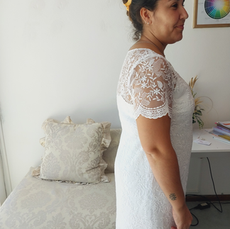Para su ceremonia civil reutilizamos el mismo encaje, creando así dos vestidos en uno: un estilo solera en crepé más liviano y forrado, que le permitió disfrutar de un diseño versátil y elegante, con la posibilidad de reutilizarlo más adelante.